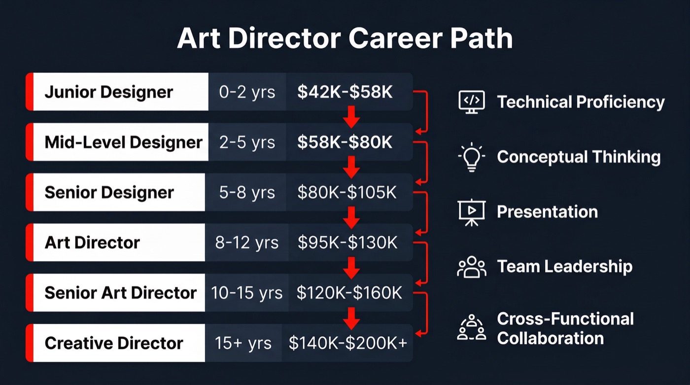 The art director career path follows a clear progression: junior designer, mid-level designer, senior designer, art director, and eventually senior art director or creative director. Each stage demands a distinct combination of technical skill, leadership ability, and business awareness. Understanding this roadmap early gives digital artists a serious competitive edge.