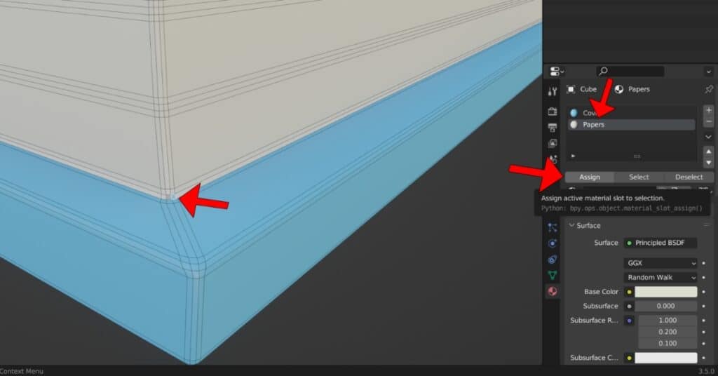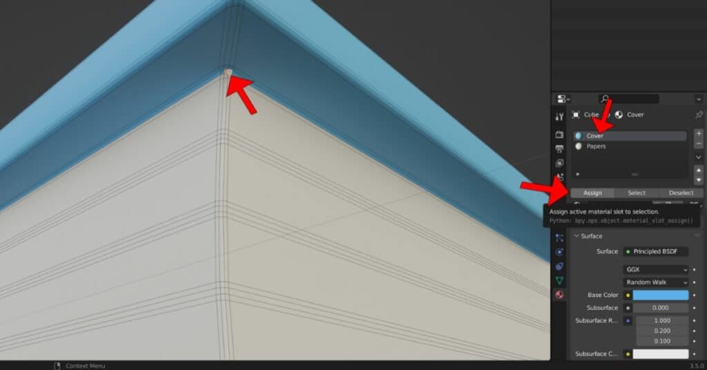 Blender occasionally experiences glitches when using specific tools. In this case, you can observe that there are two faces displaying different colors; they should have the “Papers” material applied instead of the “Cover” material.