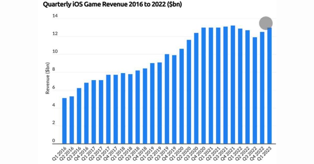 A chart showing the quarterly game revenue from 2016 to 2023 in billions for the Apple store from BusinessofApps and created with Data.ai and Sensor Tower.