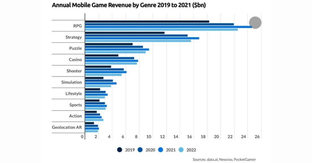 | Mobile game genres | Revenue for 2022 (billions) | Revenue for 2020 (billions) | Revenue for 2019 (billions) |