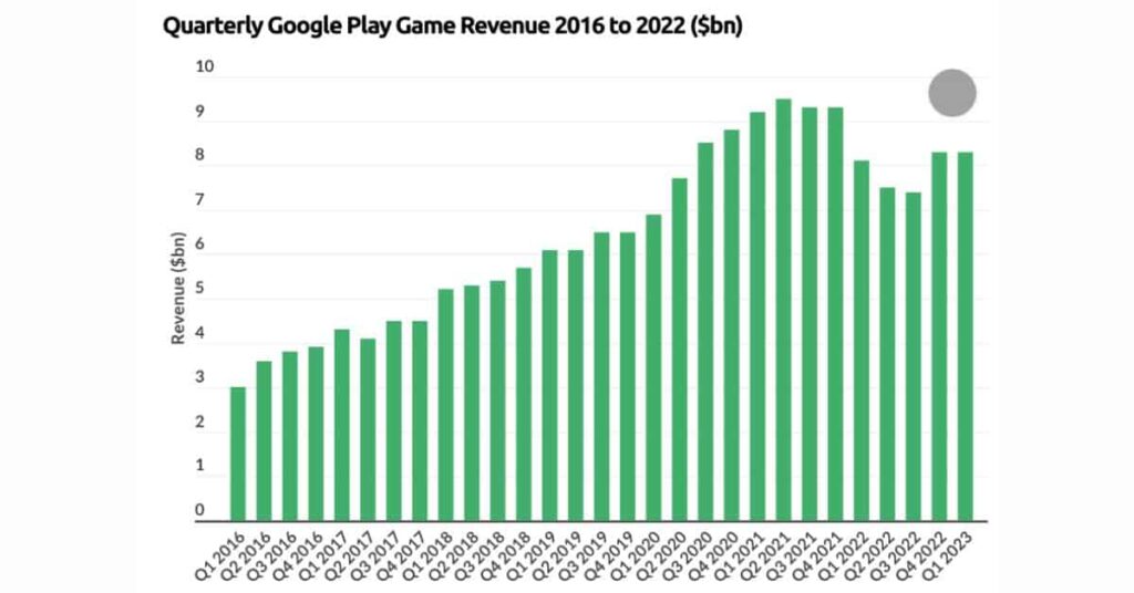 A chart showing the quarterly game revenue from 2016 to 2023 in billions for the Google Play Store from BusinessofApps and created with Data.ai and Sensor Tower.