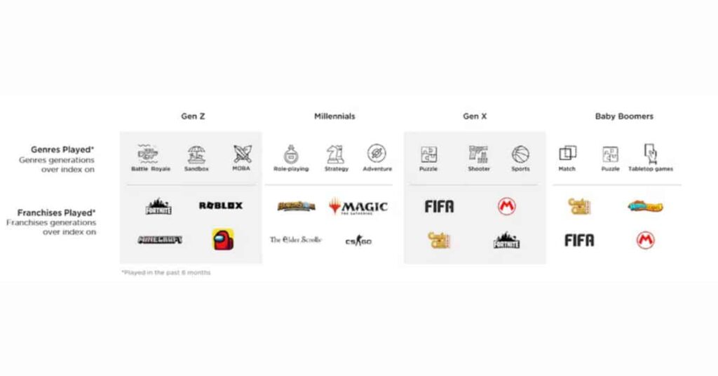 | Game genre | 0-19 years | 20-29 years | 30-39 years | 40-49 years | 50+ years |