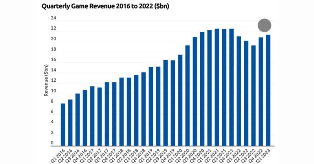 A chart showing the quarterly game revenue from 2016 to 2023 in billions from BusinessofApps and created with Data.ai and Sensor Tower.