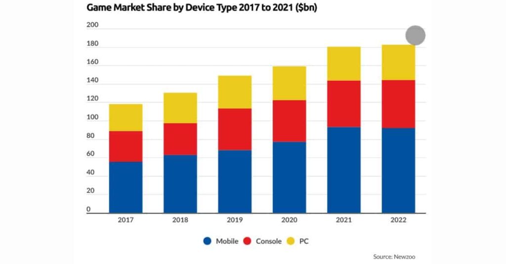 Interestingly, mobile games actually take the cake when it comes to all device games. From 2017 onwards, it’s beaten the revenue from console and PC games and looks to only be growing.