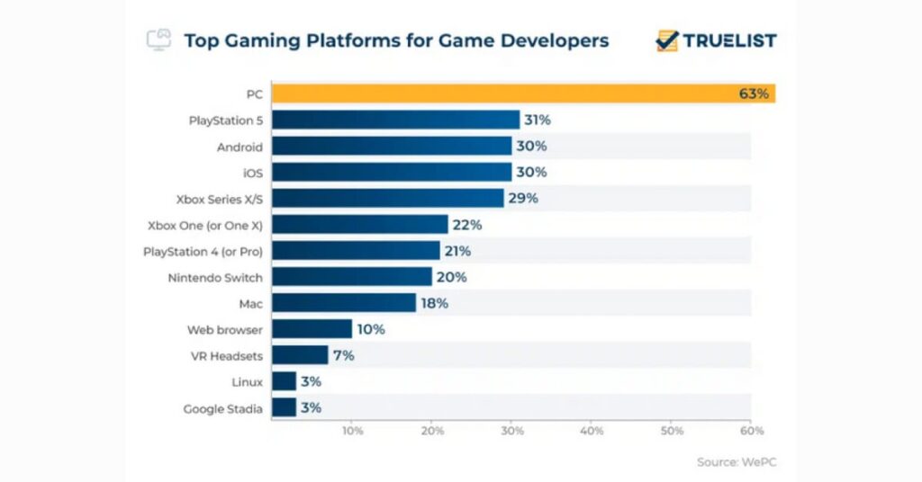 Another interesting fact is that although PC games have the lowest market share, over 63% of developers still focus on PC games. This is because, although there’s less market revenue, PC gamers offer a steady revenue.