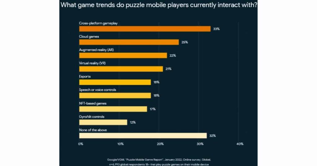 You also want to look at trends. While having some trends that your audience likes is important, having too many can be off-putting. It’s also important to note that roughly a third of all puzzle mobile players don’t interact with any of the trends below.