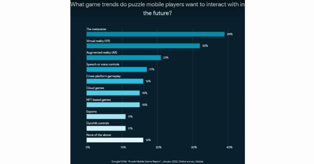 This may be because they have a need that hasn’t been met yet. If you look at the visual below, you can see that there are a few trends players are hoping to see more in future puzzle games or updates to current puzzle games. Metaverse is a big one that almost 40% of players want to see.