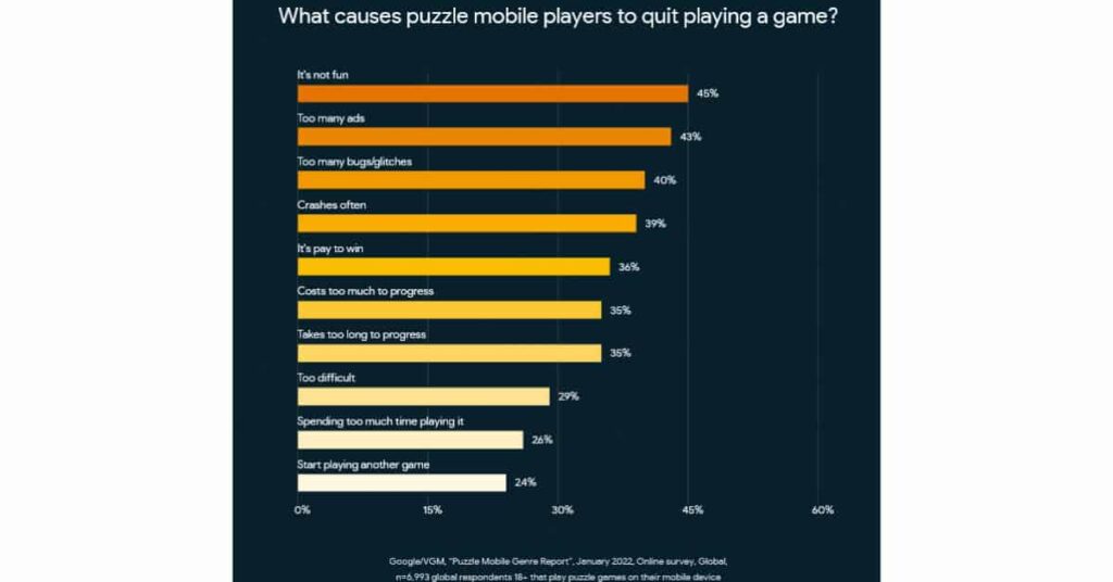 A graph showing survey results on why people grow bored or quit a mobile puzzle game from GamesWithGoogle