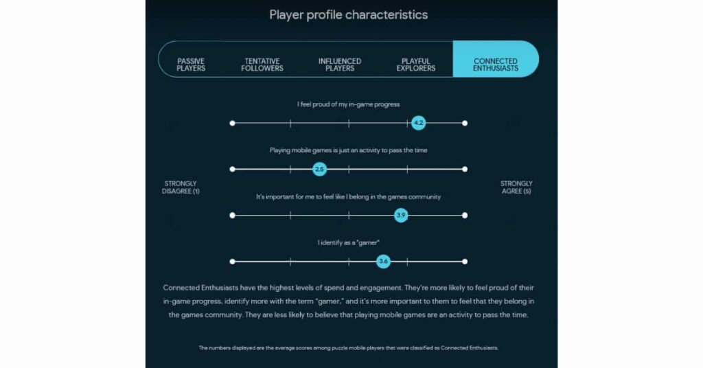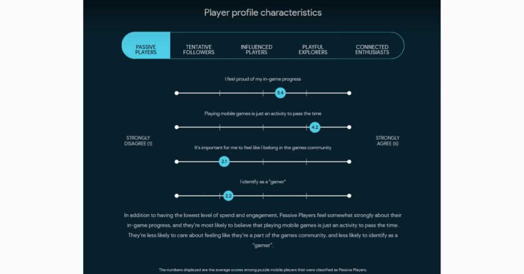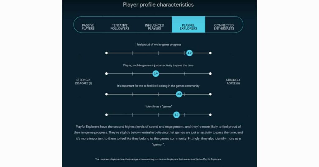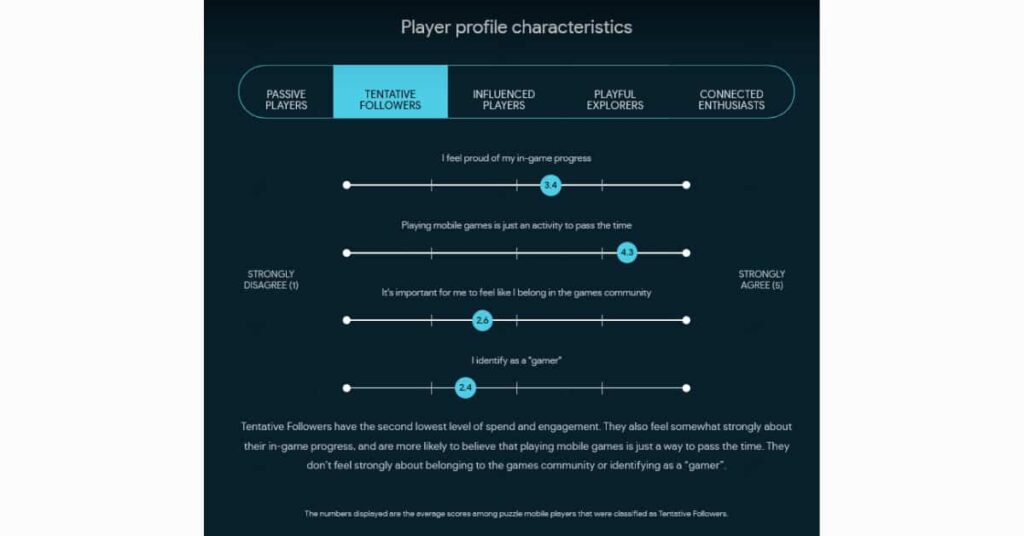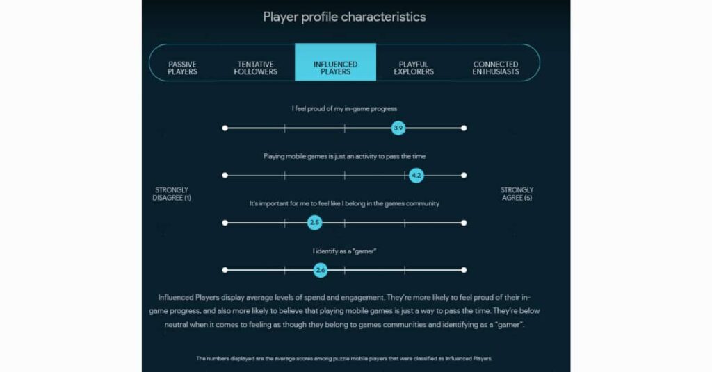 Since not all mobile gamers actually consider themselves gamers, there are other ways to break down players. Google breaks mobile gamers into five categories: Passive players, tentative followers, influenced players, playful explorers, and connected enthusiasts.
