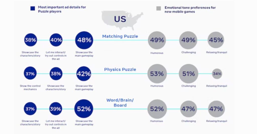 A visual showing the various features in puzzle ads that players respond the most to in the US based on details and emotions from Udonis