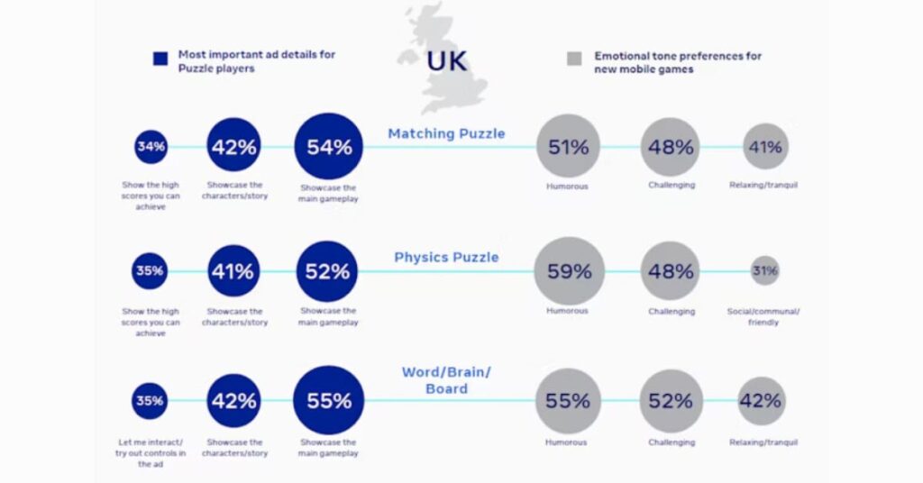 A visual showing the various features in puzzle ads that players respond the most to in the UK based on details and emotions from Udonis