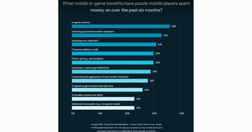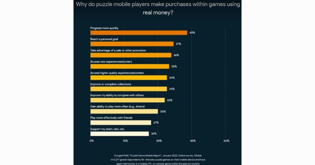 A visual of a survey showing the breakdown of why players spend real money in puzzle games from GamesWithGoogle