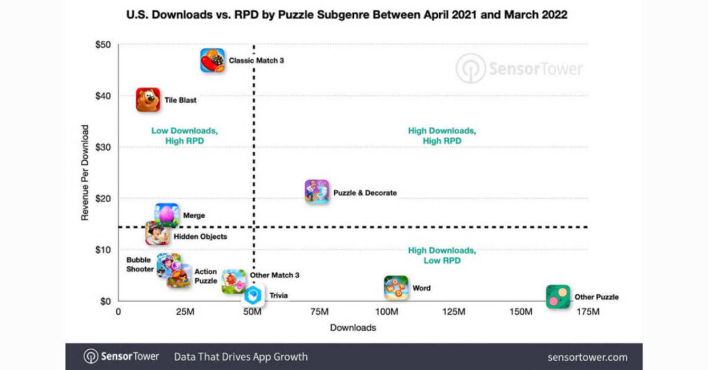 A visual comparing popular mobile puzzle games based on their number of downloads vs. revenue per download from SensorTower