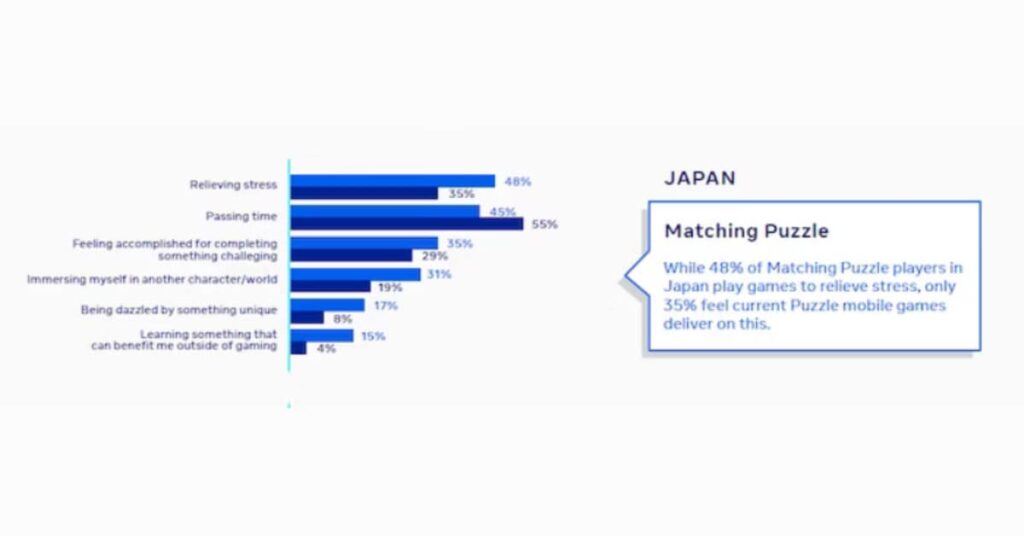 A graph showing the different reasons people play mobile games and how much each puzzle game category provides these reasons in Japan from Udonis