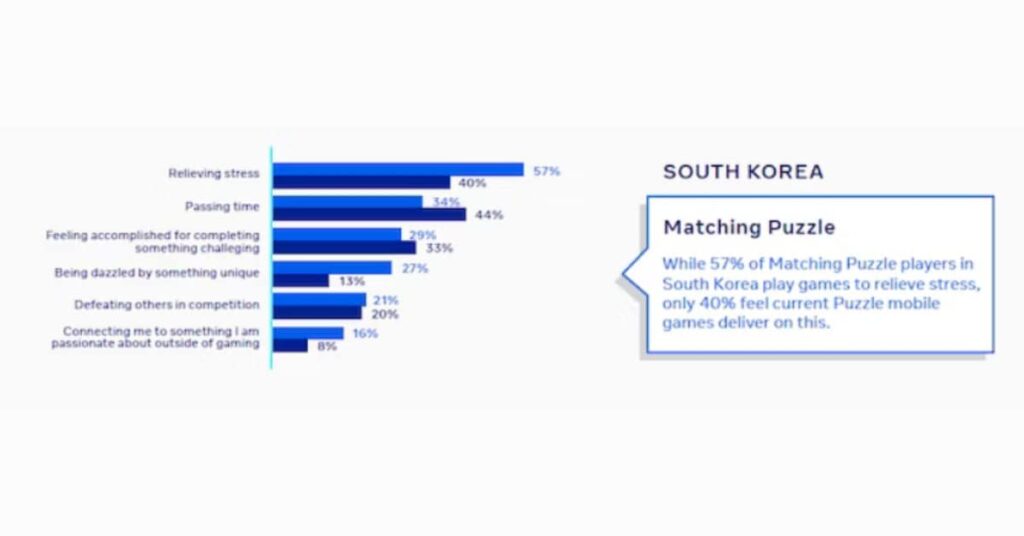 A graph showing the different reasons people play mobile games and how much each puzzle game category provides these reasons in South Korea from Udonis